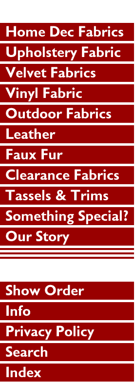 See all our discount and closeout designer home decor drapery, upholstery, multi-purpose, multi-use, canvas, vinyl, linen, mohair, cotton velvet fabrics, trims and other interior decorating products; click on side page buttons.