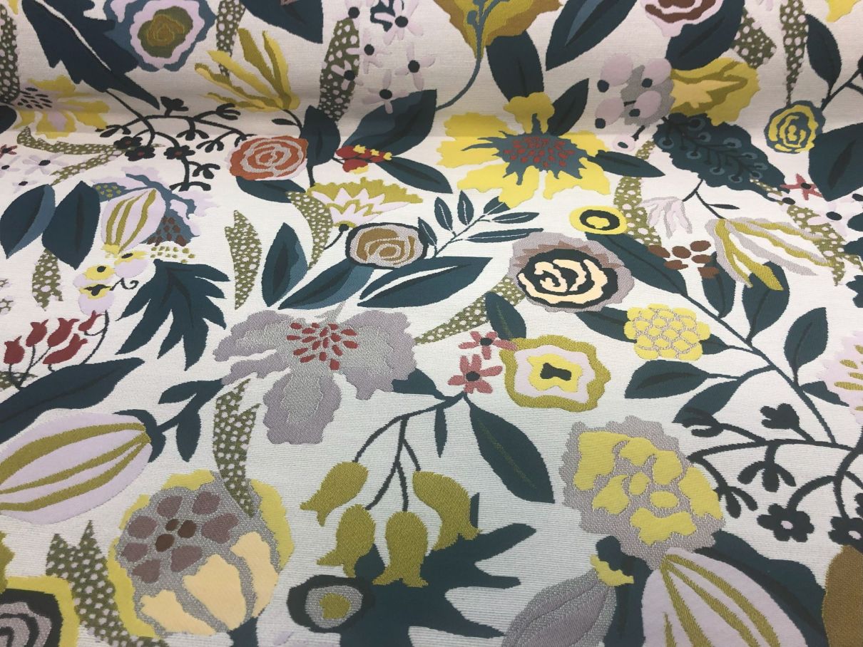 A decorative upholstery fabric featuring a bold, contemporary floral pattern. The design consists of large-scale, stylized flowers and foliage in a mix of earthy and vibrant tones — including mustard yellow, olive green, soft lavender, rust orange, muted pink, and deep teal — all set against a light cream or off-white background.