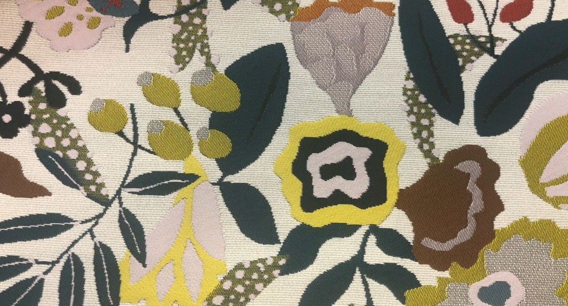 Woven pattern (jacquard-style) rather than printed, giving it a slightly raised texture and a tactile quality ideal for upholstery use. The overall style combines modern botanical motifs with a touch of retro charm, making it well-suited for accent chairs, cushions, or drapery in eclectic, modern, or mid-century inspired interiors.