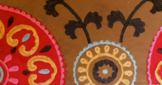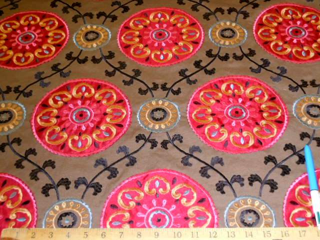 Braemore Embroidered Decorating Fabric KARMANA color Fiesta, traditional suzani with poly satin applique, mutipurpose decorator fabric