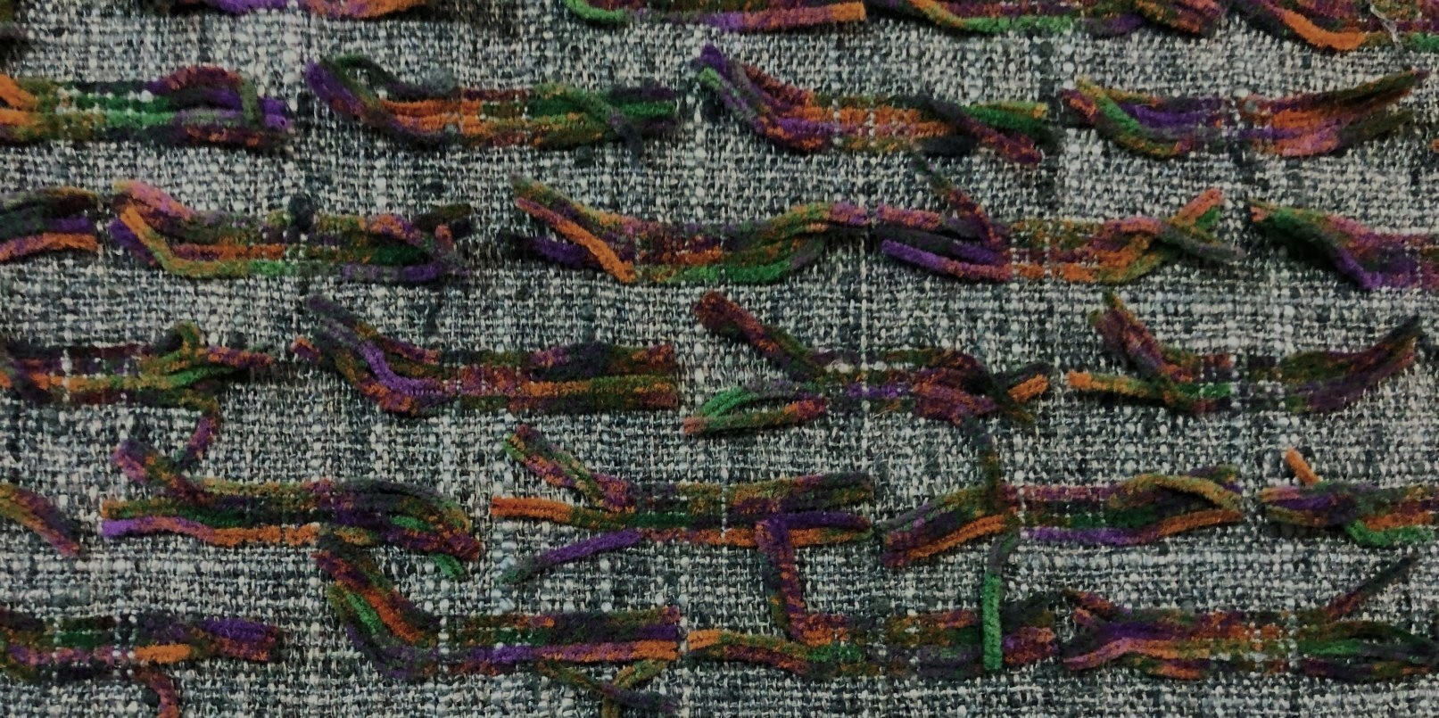 Fringe Details: The most prominent feature is the colorful, loose thread loops and ends (the "eyelashes") that stand out from the surface. These fringes appear in contrasting shades of purple, rust-orange, and dark green.
