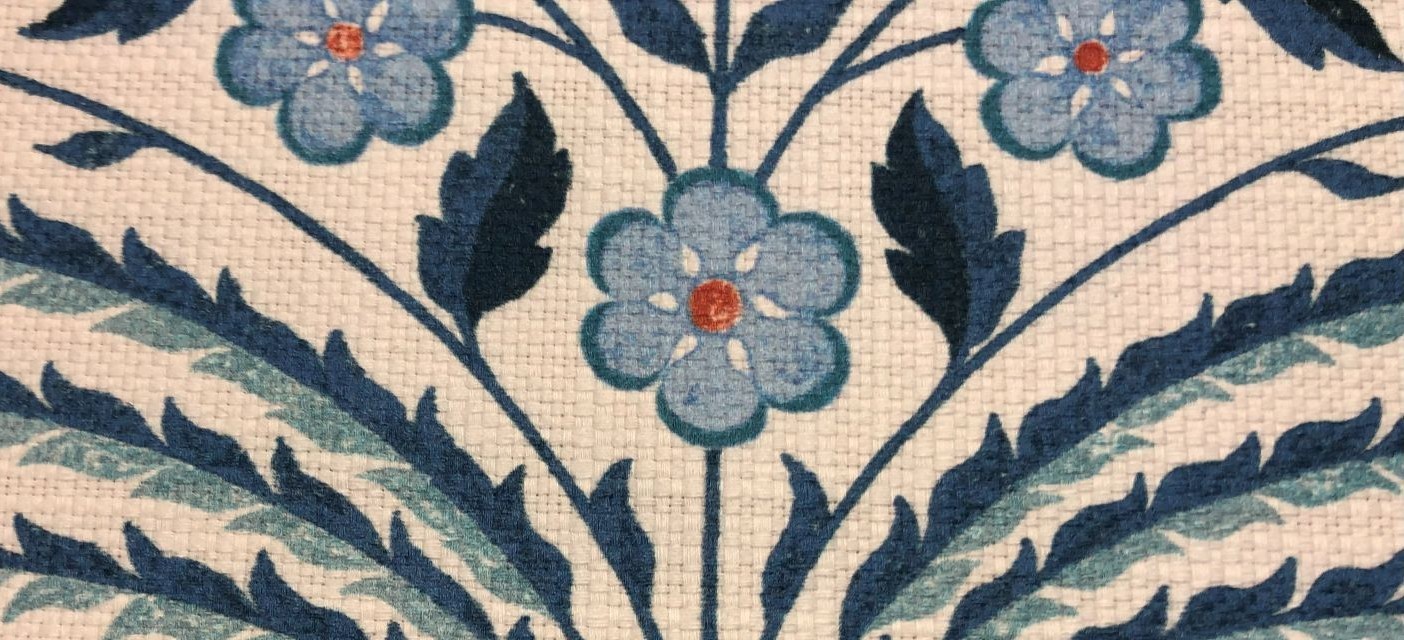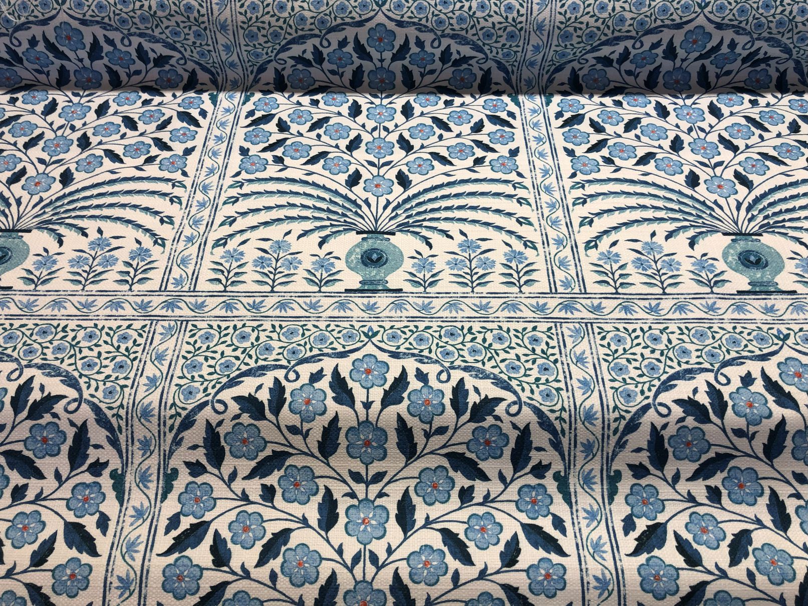 From P Kaufmann this fabric features a classic block-print inspired botanical design in soothing shades of blue and white. The pattern consists of stylized floral arrangements sprouting from urn-shaped vases, arranged in vertical panels separated by narrow, vine-like borders.