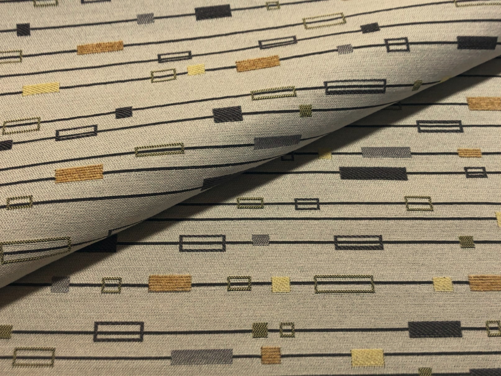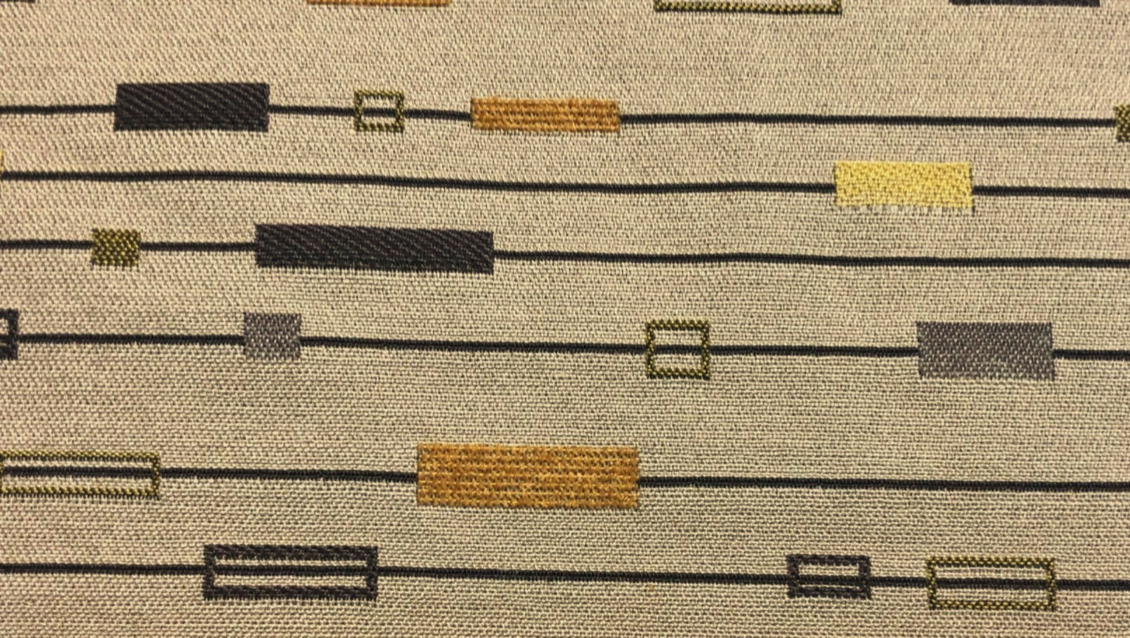 This fabric features a modern geometric pattern on a light tan woven background. The design consists of dark brown horizontal lines running evenly across the fabric, each intersected by rectangular and square shapes in varying sizes. The shapes are rendered in a mix of muted gold, tan, olive green, charcoal gray, and black tones, giving it a sleek and balanced look.