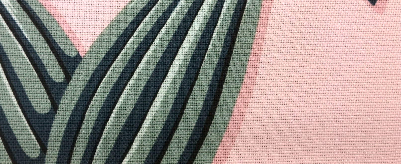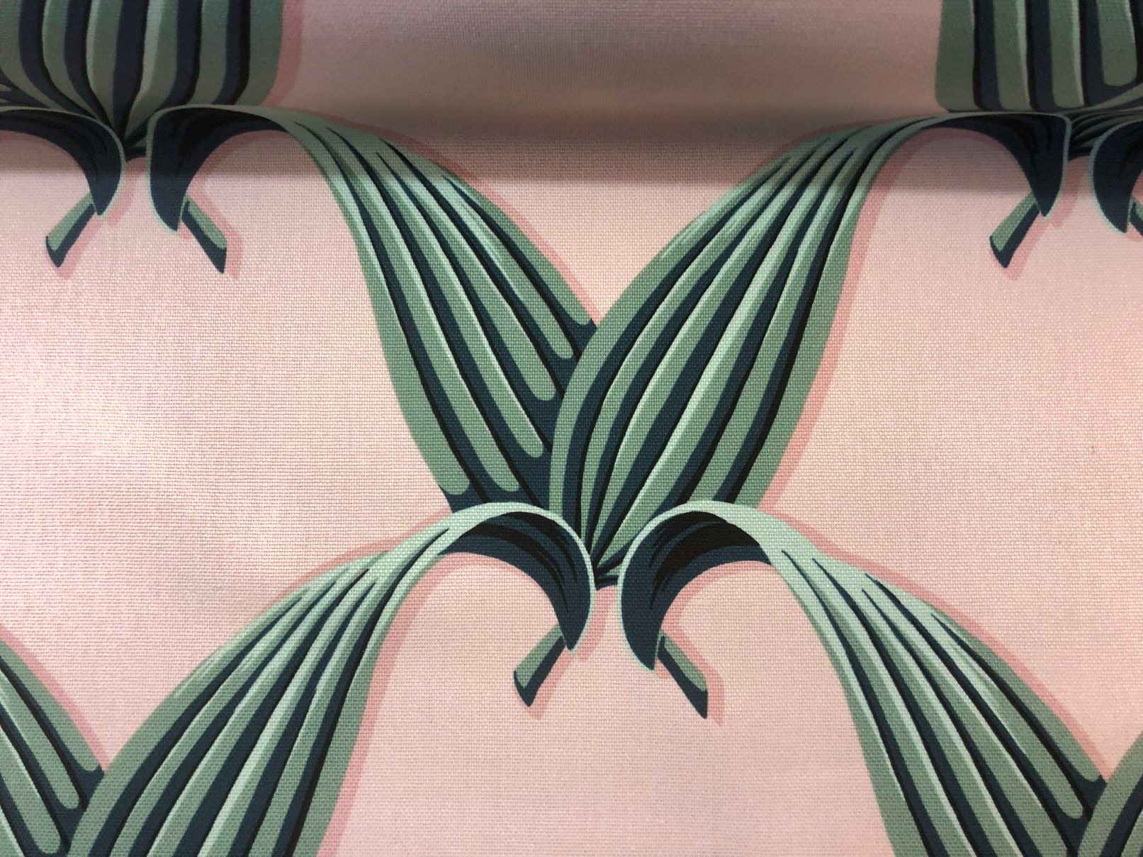 P/K Lifestyle's Novogratz Ombre Palms fabric in the "Blushing" colorway is a 100% cotton screen-printed textile featuring a contemporary, graphic interpretation of splayed palm leaves. This medium-weight fabric is versatile for home decor, commonly used for draperies, toss pillows, and light upholstery projects.