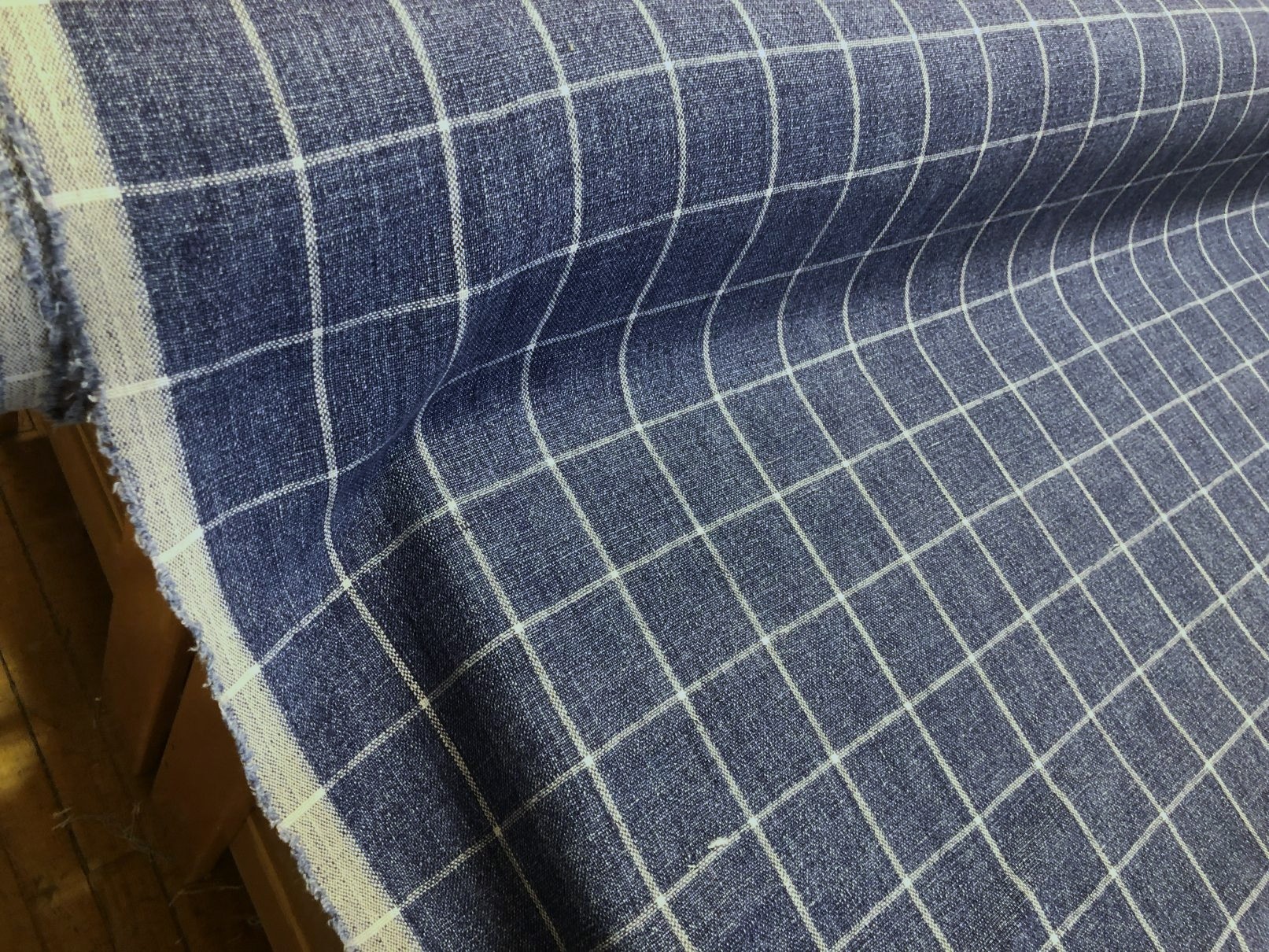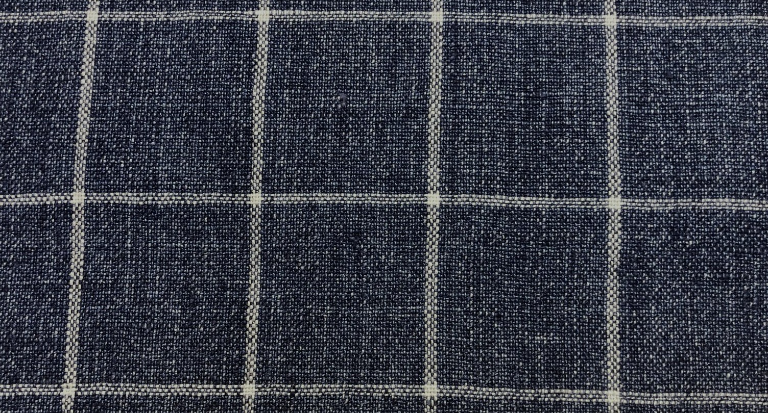 The P Kaufmann Bennet Woven Linen Decorator Fabric in Indigo is a high-quality 100% linen woven fabric. It features a classic indigo blue and white windowpane check pattern.