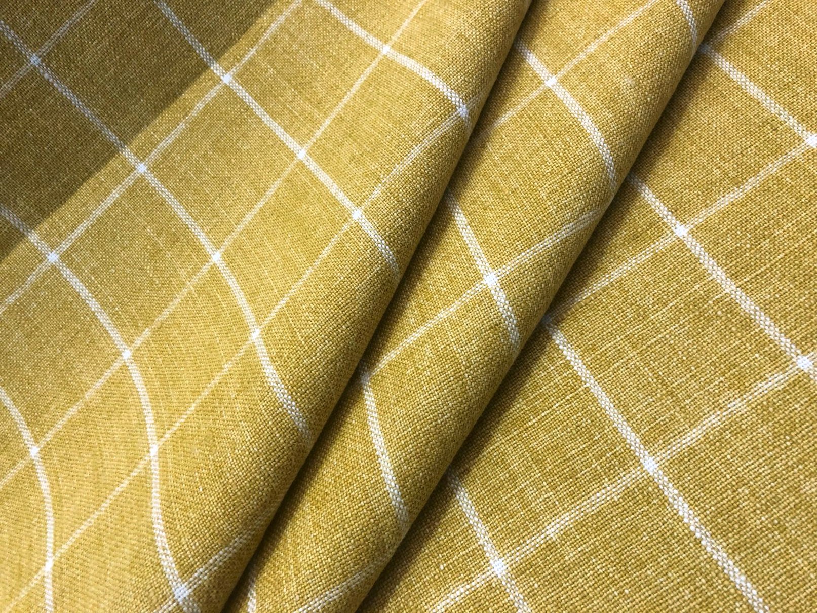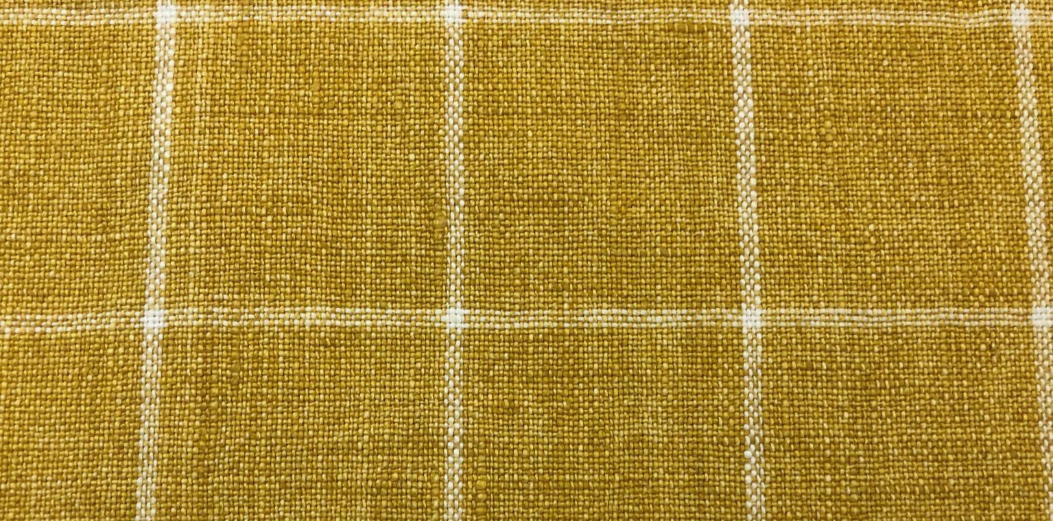 The P Kaufmann Bennet Woven Linen Decorator Fabric in Yolk is a high-quality 100% linen woven fabric. It features a classic yellow and natural windowpane check pattern.