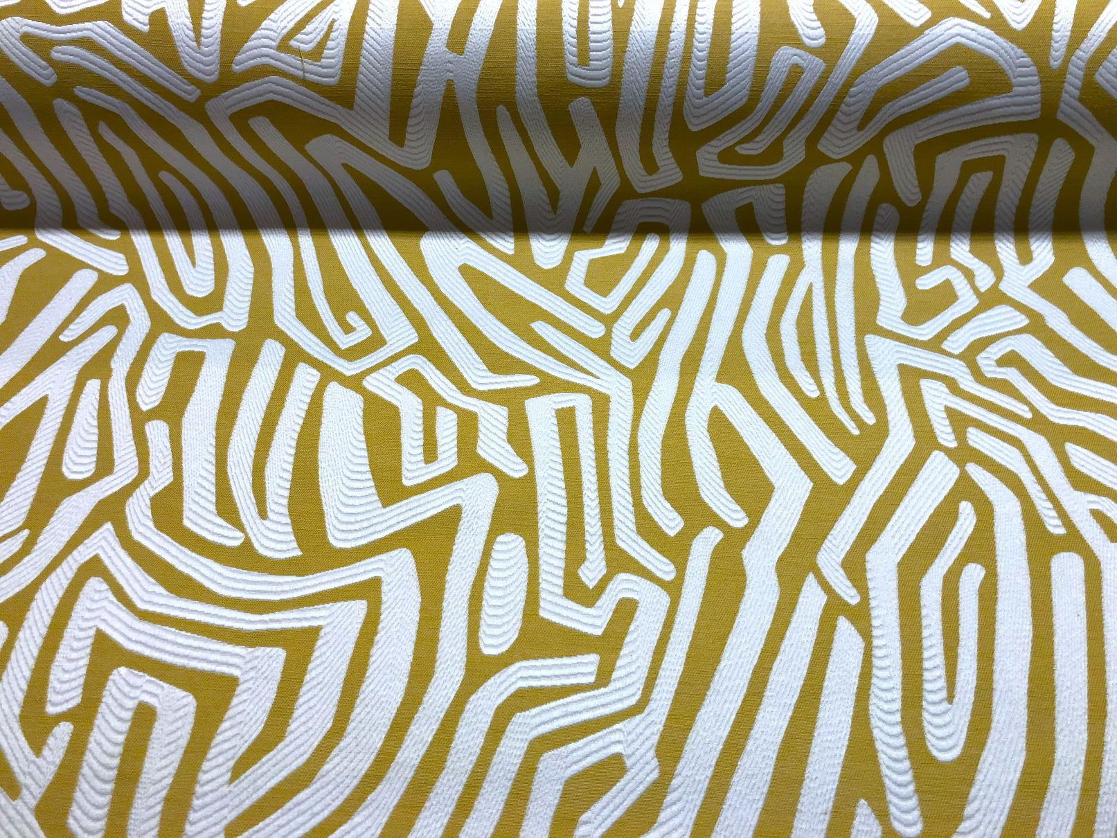 P/Kaufmann Kiki Sunglow is a multi-purpose decorative fabric featuring a modern, abstract lightly textured geometric pattern in a bold golden-yellow (often described as chartreuse, topaz, or ochre) and cream. The design is often referred to as "Chartreuse Waves," "Zuri," or "Cub Topaz," characterized by large-scale, swirly, skin-inspired lines that resemble an abstract animal print.