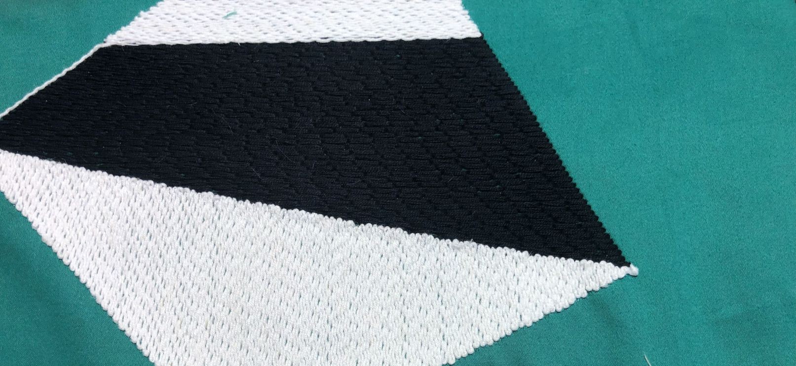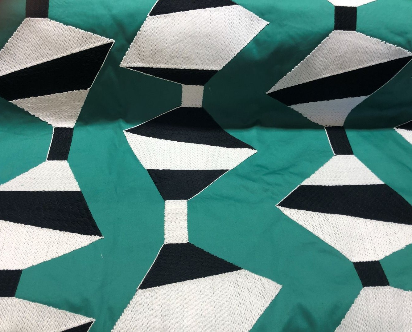 A bold, geometric design embroidered onto a deep jade green background. The embroidery is woven in a monochrome dance, black and white threads intertwine to pull bold, contrasting forms into focus.