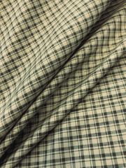 Light weight drapery and home decor fabric in an olive green check on a light avocado ground with a slight iridescent sheen