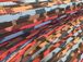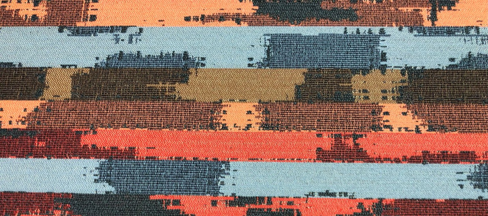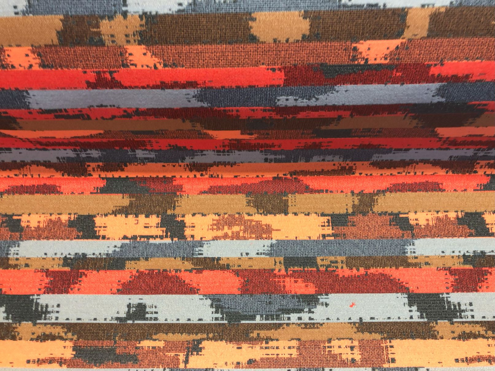 This upholstery fabric features a bold, modern geometric design with horizontal, pixelated stripes in a multi-color palette. The dominant hues include burnt orange, muted teal blue, olive green, brick red, and dark brown, arranged in irregular, blocky bands that create a digital or camouflage-like effect.
