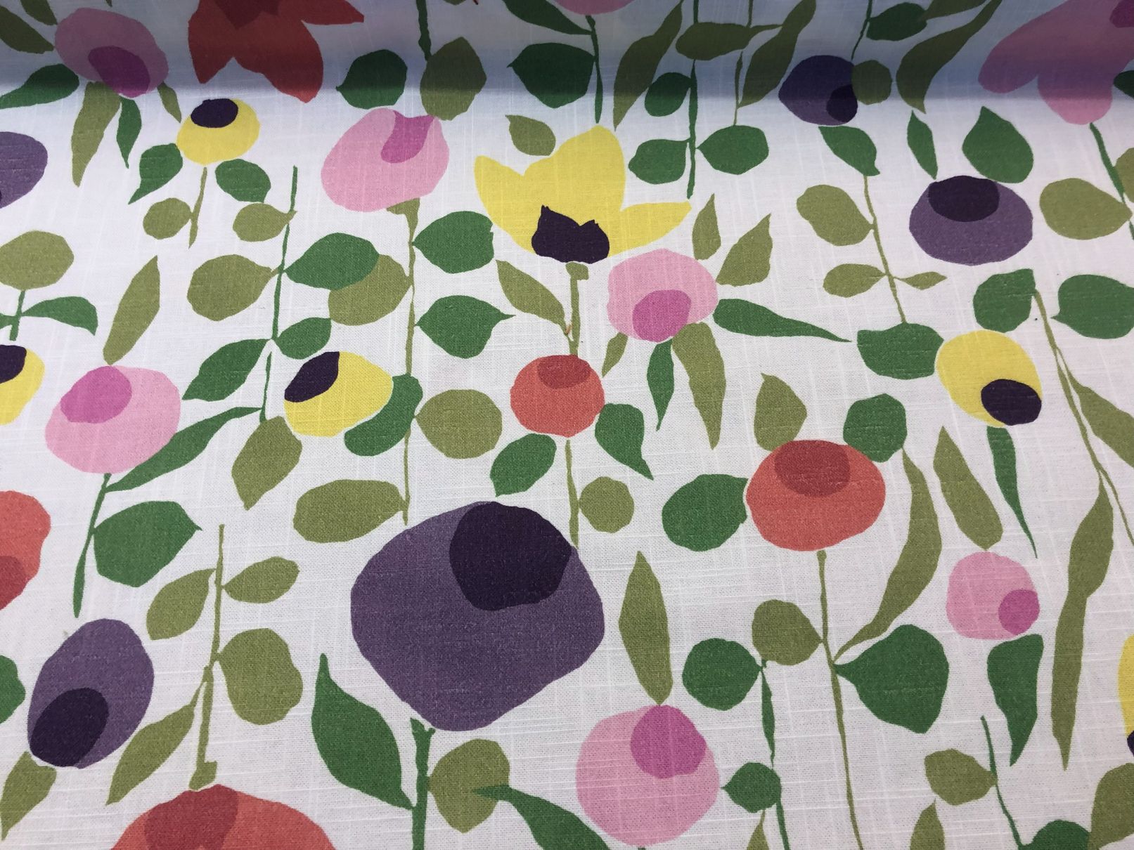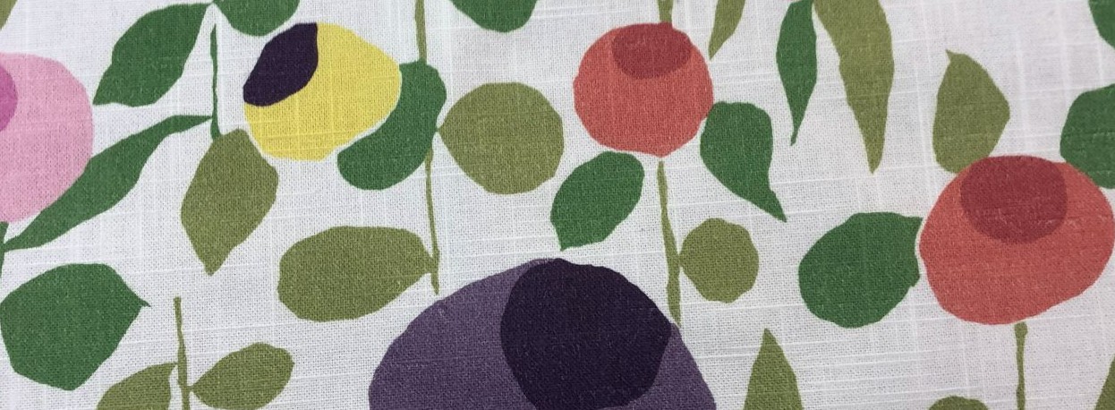 Pattern: A modern floral and vine print with a retro theme. It showcases colorful, stylized blooms and leaves on a clean background.