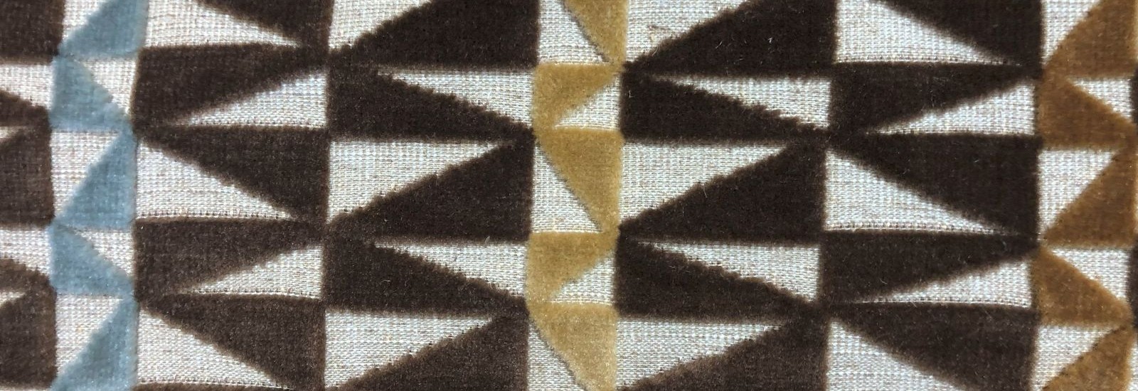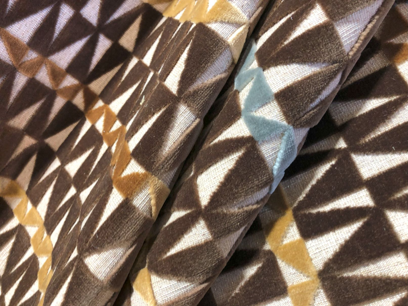 The triangles are cut or embossed into a soft, velvety pile — a cut velvet upholstery fabric — while the lighter area is flat and woven. This creates a tactile contrast with a sense of depth and dimension.